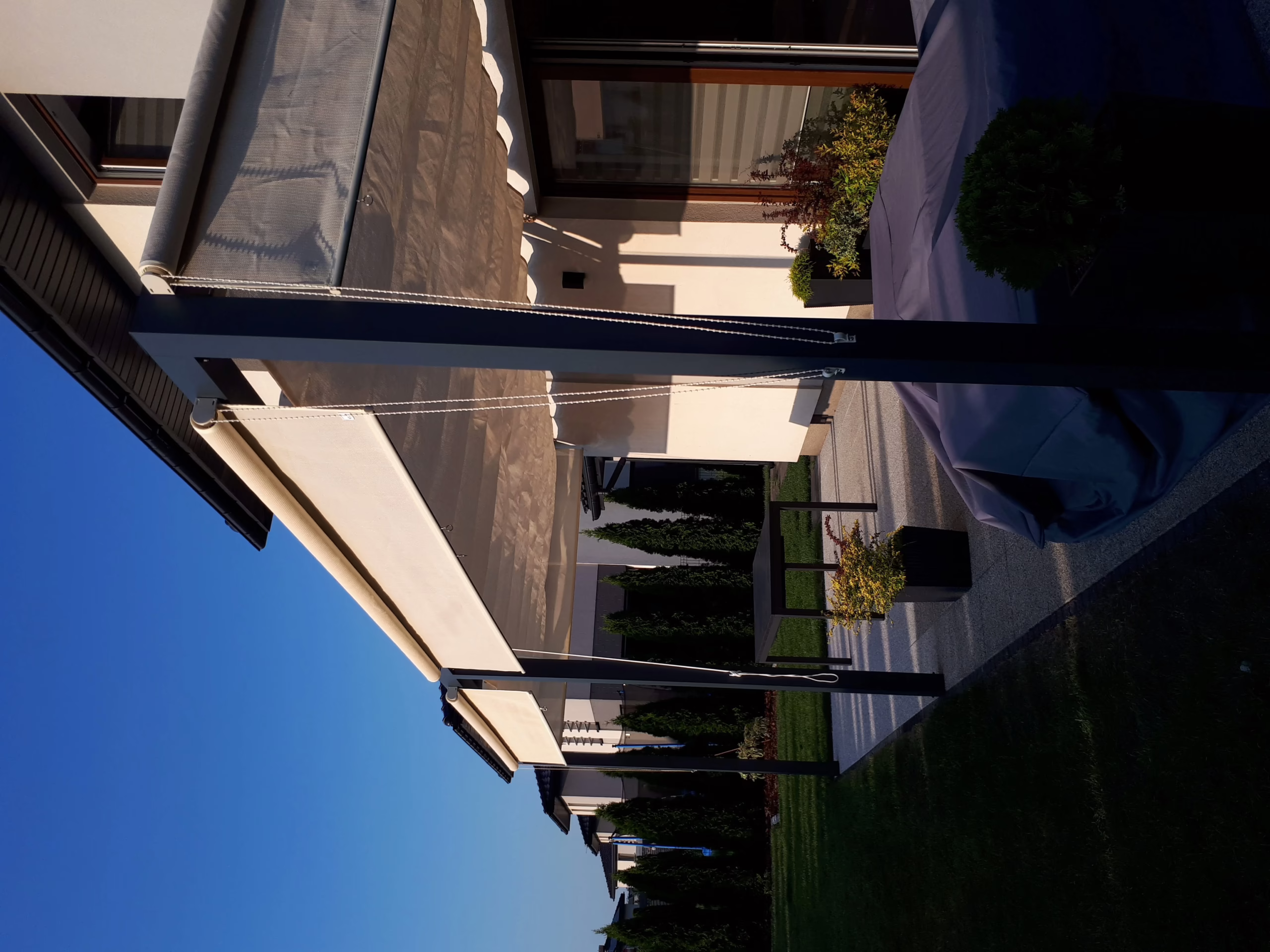 Do realizacji wykorzystano: pergolę aluminiową przyścienną 2 w kolorze antracytowym, rolety poziome, rzymskie Coolfit® w kolorze złamanej bieli oraz rolety pionowe Coolfit® w kolorze złamanej bieli.