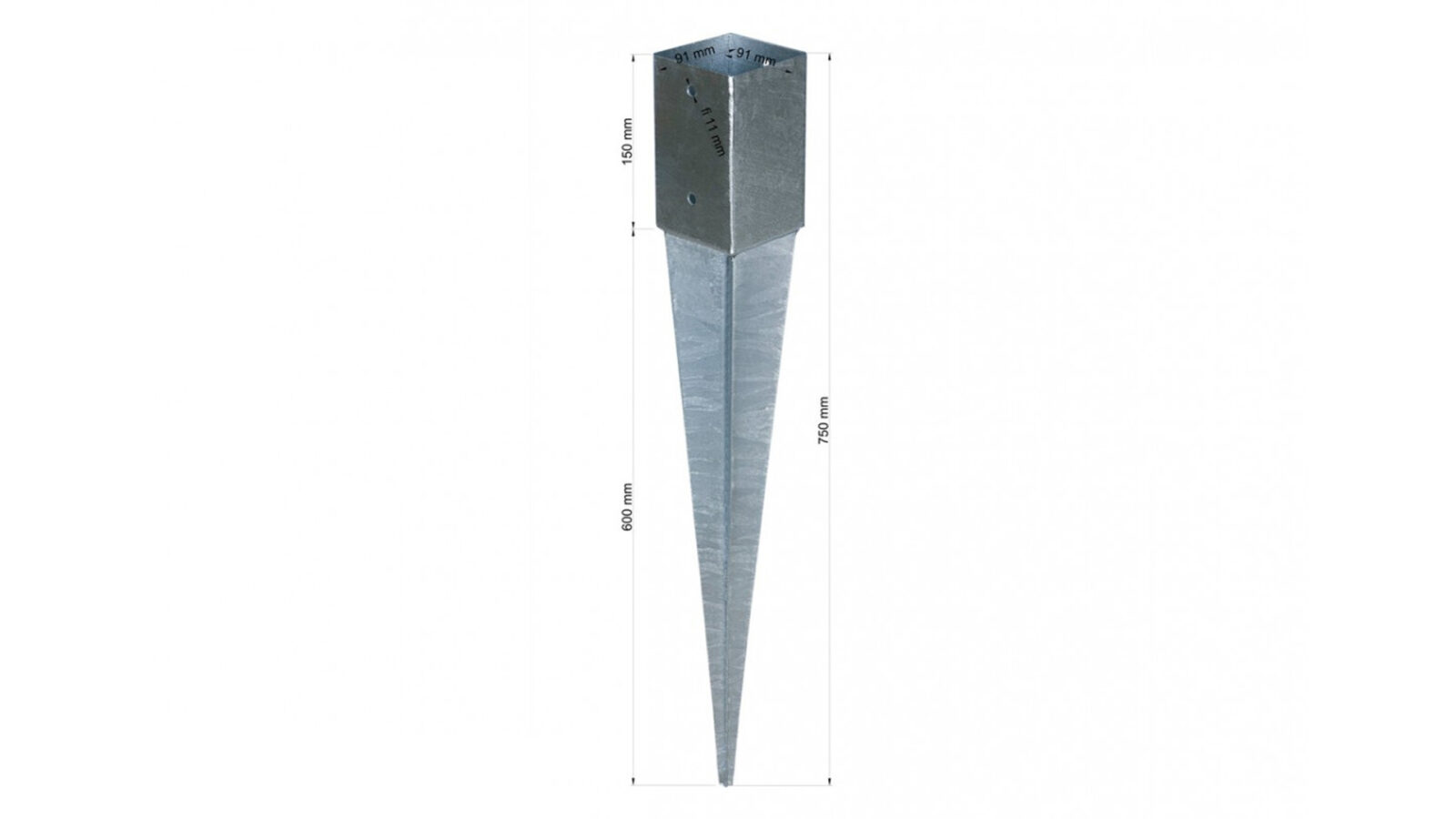 Długość całkowita kotwy: 750 mm, w tym 600 mm do wbicia w ziemię.
