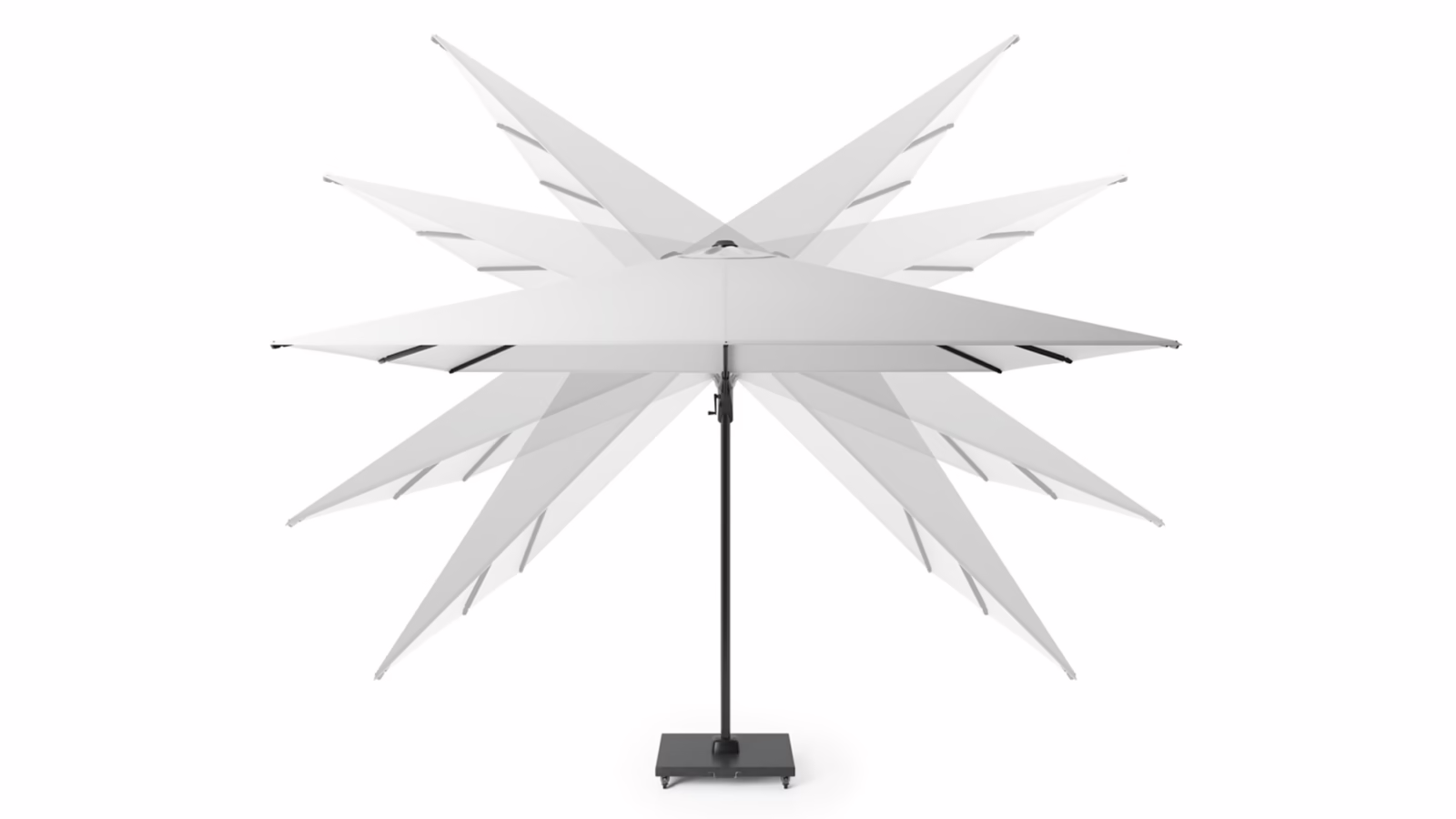 - Zapewnia duże zacienienie wybranej powierzchni, dzięki możliwości pochylenia dwupłaszczyznowego oraz podstawie obracającej się o 360°