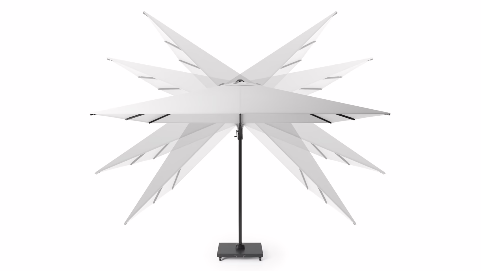 • Zapewnia duże zacienienie wybranej powierzchni, dzięki możliwości pochylenia jednopłaszczyznowego oraz podstawie obracającej się o 360°
