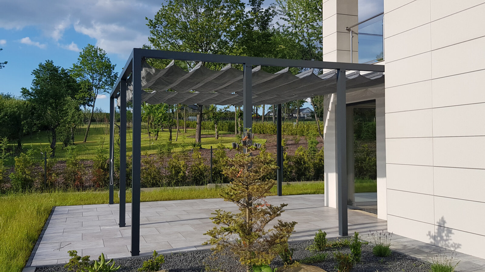 Pergola aluminiowa wraz z roletą poziomą rzymską Coolfit® tworzy pełną konstrukcję zacieniająca strefę relaksu na tarasie lub w ogrodzie. Występuje w trzech wariantach konstrukcyjnych i różnych rozmiarach. Istnieje możliwość dopasowania pergoli do każdego wymiaru tarasu.