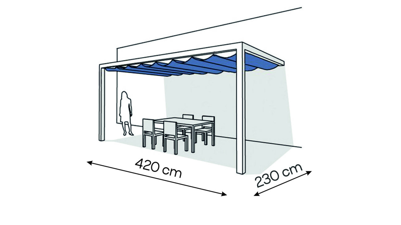 Pergola aluminiowa wraz z roletą poziomą rzymską Coolfit® tworzy pełną konstrukcję zacieniająca strefę relaksu na tarasie lub w ogrodzie. Występuje w trzech wariantach konstrukcyjnych i różnych rozmiarach. Istnieje możliwość dopasowania pergoli do każdego wymiaru tarasu.