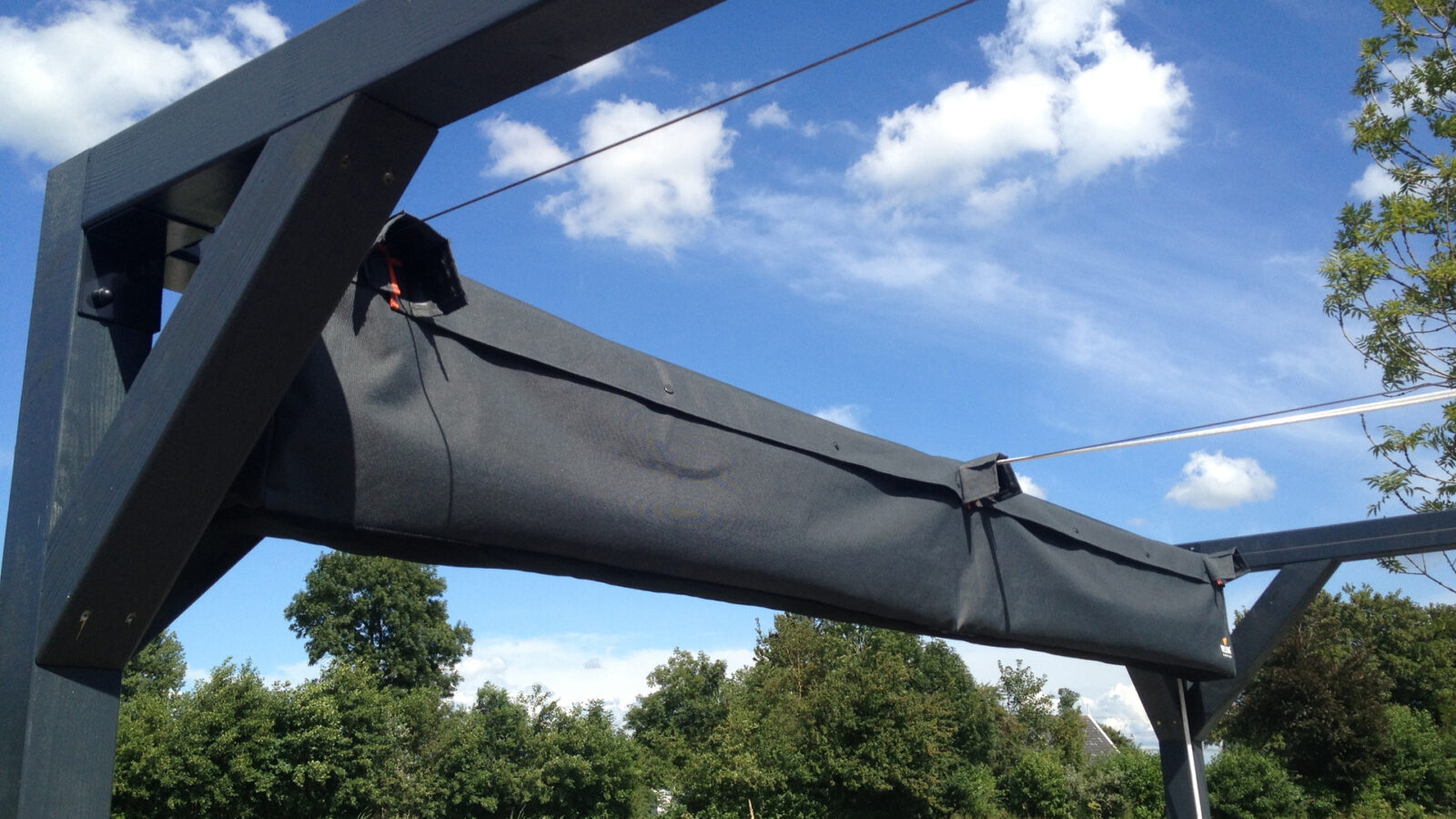 Roletę poziomą rzymską należy maksymalnie zwinąć a następnie założyć na nią pokrowiec i przymocować go do pergoli.