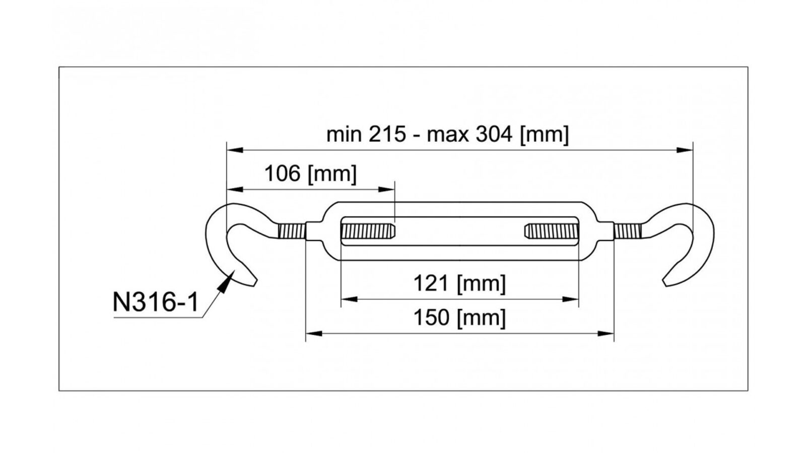 Śruba rzymska M10 wykonana jest ze stali nierdzewnej kwasoodpornej 316. Może być opcjonalnie wykorzystana do mocowania żagli. Przydaje się do napinania żagla oraz do regulacji odległości między żaglem, a masztem lub szyną z wózkiem przymocowaną do belki z drewna.