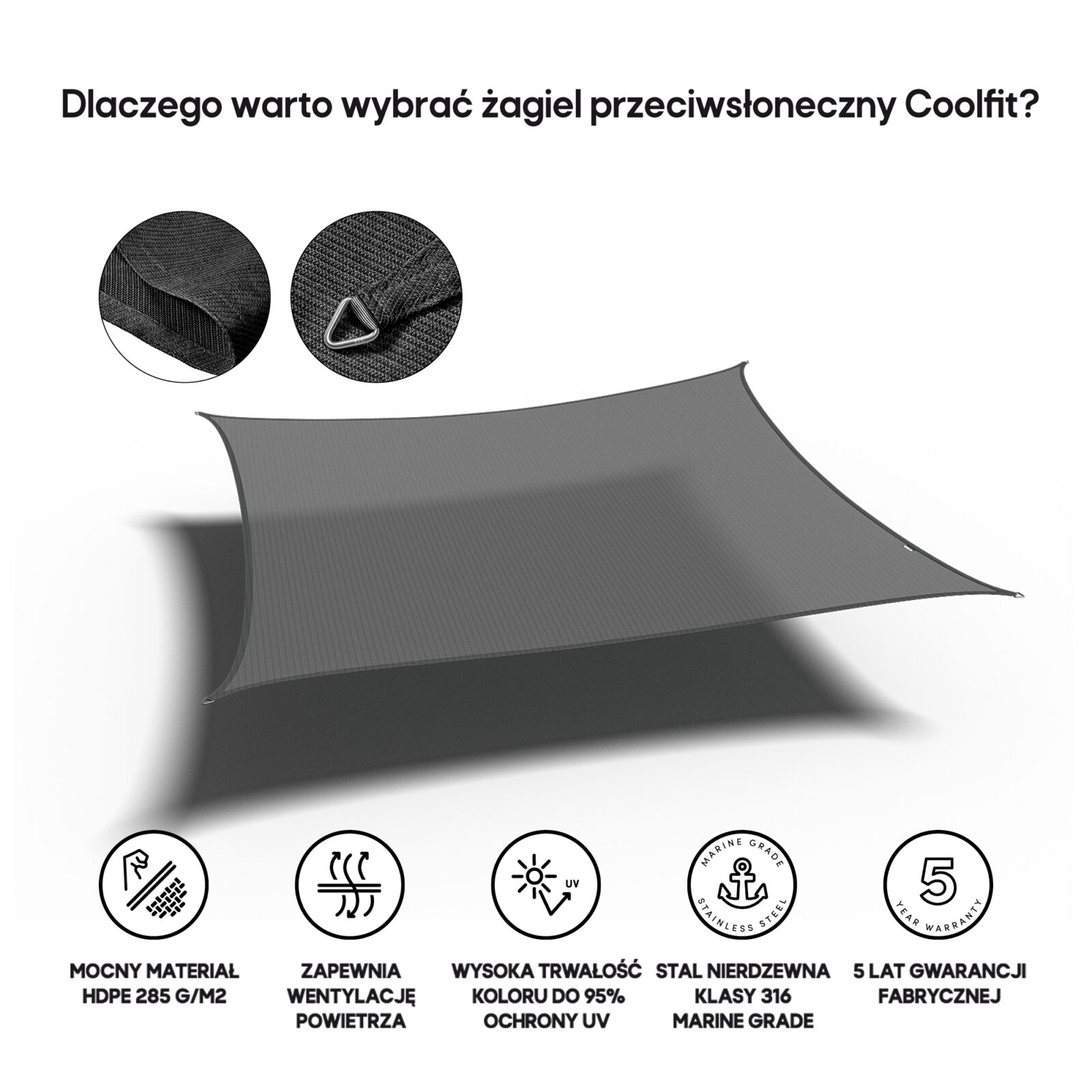 Materiał żagli przeciwsłonecznych Coolfit® to polietylen o dużej gęstości (HDPE) o gramaturze 285 g/m².