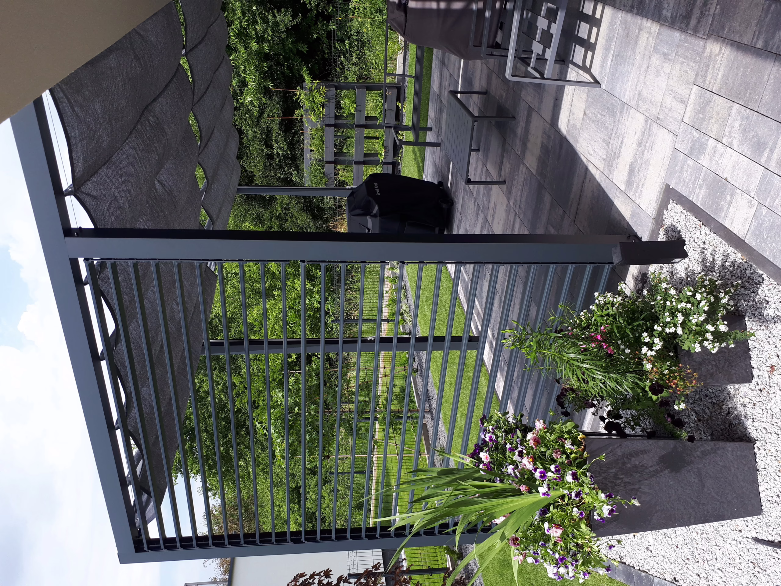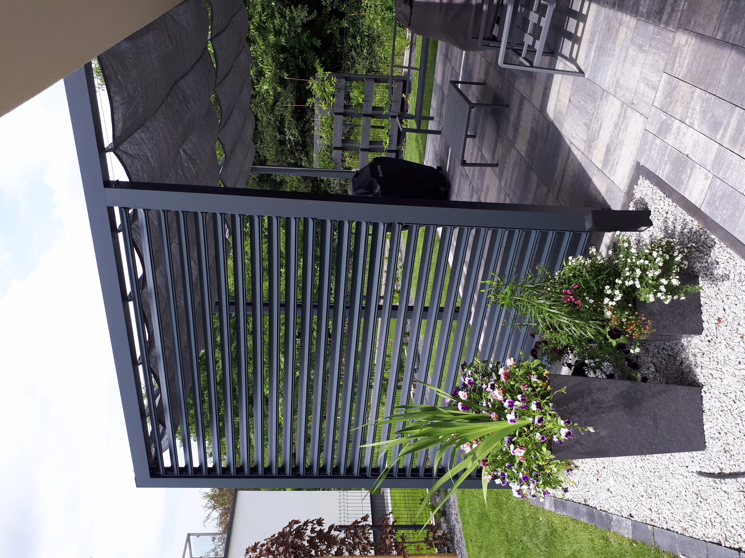 Do realizacji wykorzystano: pergolę aluminiową przyścienną 1 w kolorze antracytowym, rolety poziome, rzymskie Coolfit® w kolorze antracytowym oraz ruchome lamele aluminiowe w kolorze antracytowym.